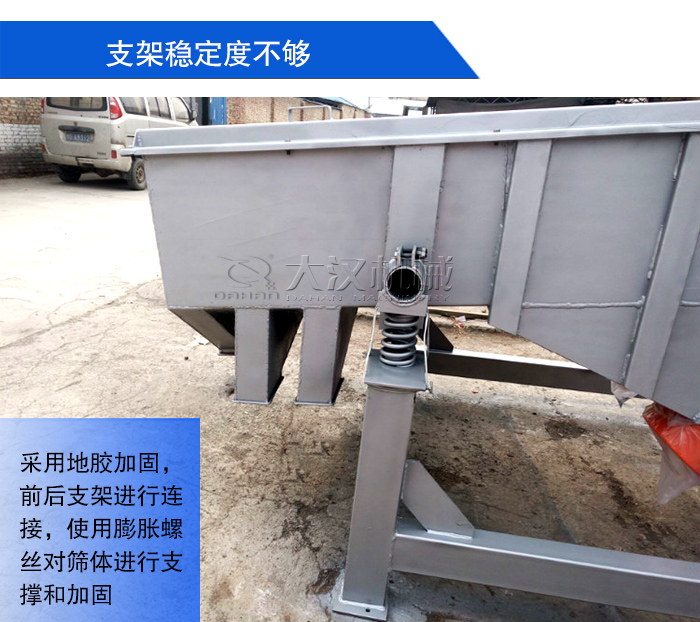 當直線振動篩支架過于簡單,就會導致篩體承受不了足夠的重量,篩機在工作時,其支架穩(wěn)定性不夠,就會出現(xiàn)左右搖擺的現(xiàn)象??梢圆捎玫啬z加固,前后支架進行連接,使用膨脹螺絲對篩體進行支撐和加固,必要時可采用水泥澆灌,使直線振動篩的作用力作用在地面上。