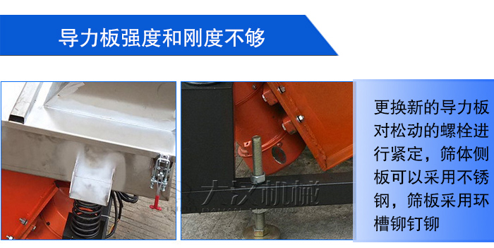 出現(xiàn)這種情況,需要更換新的導力板,對松動的螺栓進行緊定,篩體側(cè)板可以采用不銹鋼,篩板采用環(huán)槽鉚釘鉚接,保證篩體輕度和剛度足夠強。