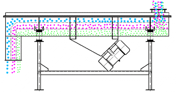 小型直線(xiàn)振動(dòng)篩主要由篩箱、篩框、篩網(wǎng)、振動(dòng)電機(jī)、電機(jī)臺(tái)座、減振彈簧、支架等組成。小型直線(xiàn)篩采用雙電機(jī)驅(qū)動(dòng),當(dāng)兩臺(tái)振動(dòng)電機(jī)做同步、反向旋轉(zhuǎn)時(shí),其偏心塊所產(chǎn)生的激振力在平行于電機(jī)軸線(xiàn)的方向相互抵消,在垂直于電機(jī)軸的方向疊為一合力,因此篩機(jī)的運(yùn)動(dòng)軌跡為一直線(xiàn)。兩電機(jī)軸相對(duì)篩面在垂直方向有一傾角,在激振力和物料自重力的合力作用下,物料在篩面上被拋起跳躍或向前作直線(xiàn)運(yùn)動(dòng),從而達(dá)到對(duì)物料進(jìn)行篩選和分級(jí)的目的。