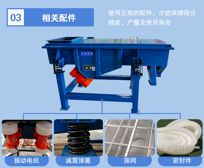 直線振動篩的配件包含:振動電機、減震彈簧、密封件、篩網、清網裝置,振動電機作為臺篩分設備的動力源其優(yōu)劣直接關系到設備的產量與使用壽命,篩網的選用也應該注重篩網的絲經、材質,配件需要有正規(guī)的配件供應商提供,這樣才能保障篩分精度、產量及使用壽命,而選擇不同配置的設備,其價格勢必會有所影響,舉例來說,防爆電機與普通電機相比,價格會貴200-300元,非金屬篩網相較金屬篩網會便宜50%。