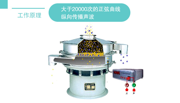 超聲振動波是一種大于20000赫茲的振動波,在超聲波振動篩中,我們一般使用在30000-40000赫茲之間的頻段。其振動特點(diǎn)為:使網(wǎng)絲在很小的振幅下,產(chǎn)生一個(gè)穿透能力很強(qiáng)、大于20000次的正弦曲線縱向傳播聲波,彈開粘附于篩網(wǎng)的物料,